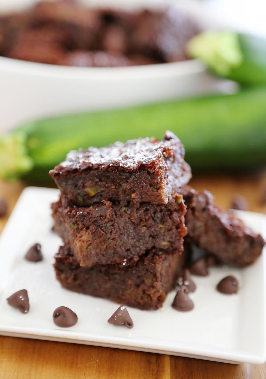 Recipe for zucchini brownies: Preheat oven to 350F, and line a 9x13 baking dish with parchment paper. Set aside. In a large mixing bowl, whisk together the first 6 ingredients and let sit at least 5 minutes. (Tip: shred zucchini in a food processor for fine shreds.) Combine all other ingredients in a separate bowl, and stir very well. Pour wet into dry, stir until evenly mixed, then pour into the baking dish. Using a full sheet of parchment or wax paper, press down very firmly until the brownie batter evenly covers the pan. Bake 19-20 minutes, then pat down hard with a pancake spatula or another sheet of parchment. (If still undercooked, it's fine. Just fridge overnight and they'll firm up!) Let zucchini brownies sit 15 minutes before trying to cut into squares, and if at all possible wait until the next day to eat them. They will be twice as flavorful! Tip: as a general rule, cutting brownies with a plastic knife prevents crumbling. Makes 20-24 squares.