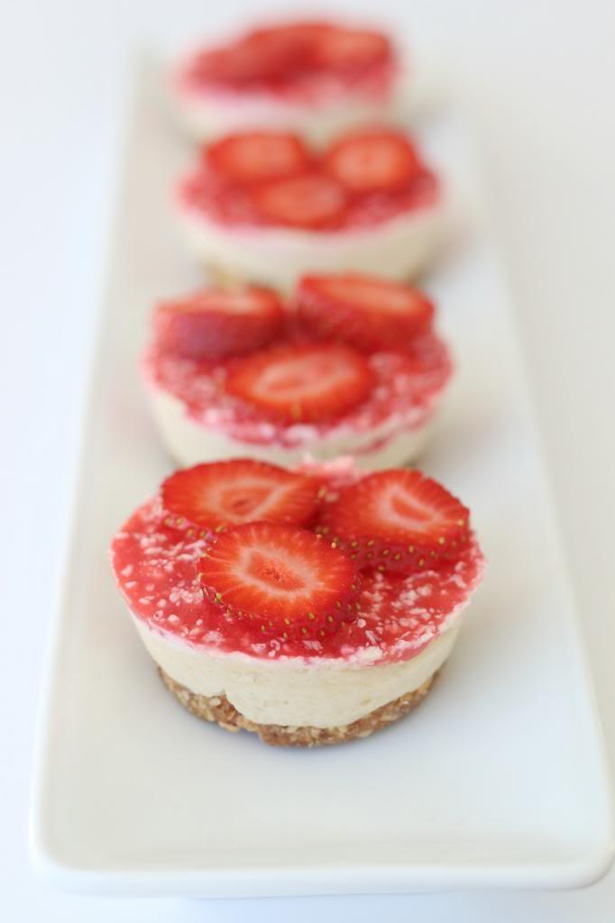 Place all of the ingredients for the crust in a food processor. Process until you have a sticky dough consistency. Take a small amount of crust and roll it into a ball. Then place it on the bottom of your muffin tin and press down firmly so it holds together. Clean your food processor (the only annoying part of this process) and place all the ingredients for the filling inside. Process until smooth. Layer the filling on top of the crust, leaving just a little bit of room for the topping. Place all of the strawberry topping ingredients into the food process and blend until you have a sauce like consistency. Add the topping on top of each mini cheesecake. Place in the freezer for about an hour or until they are set. Enjoy!